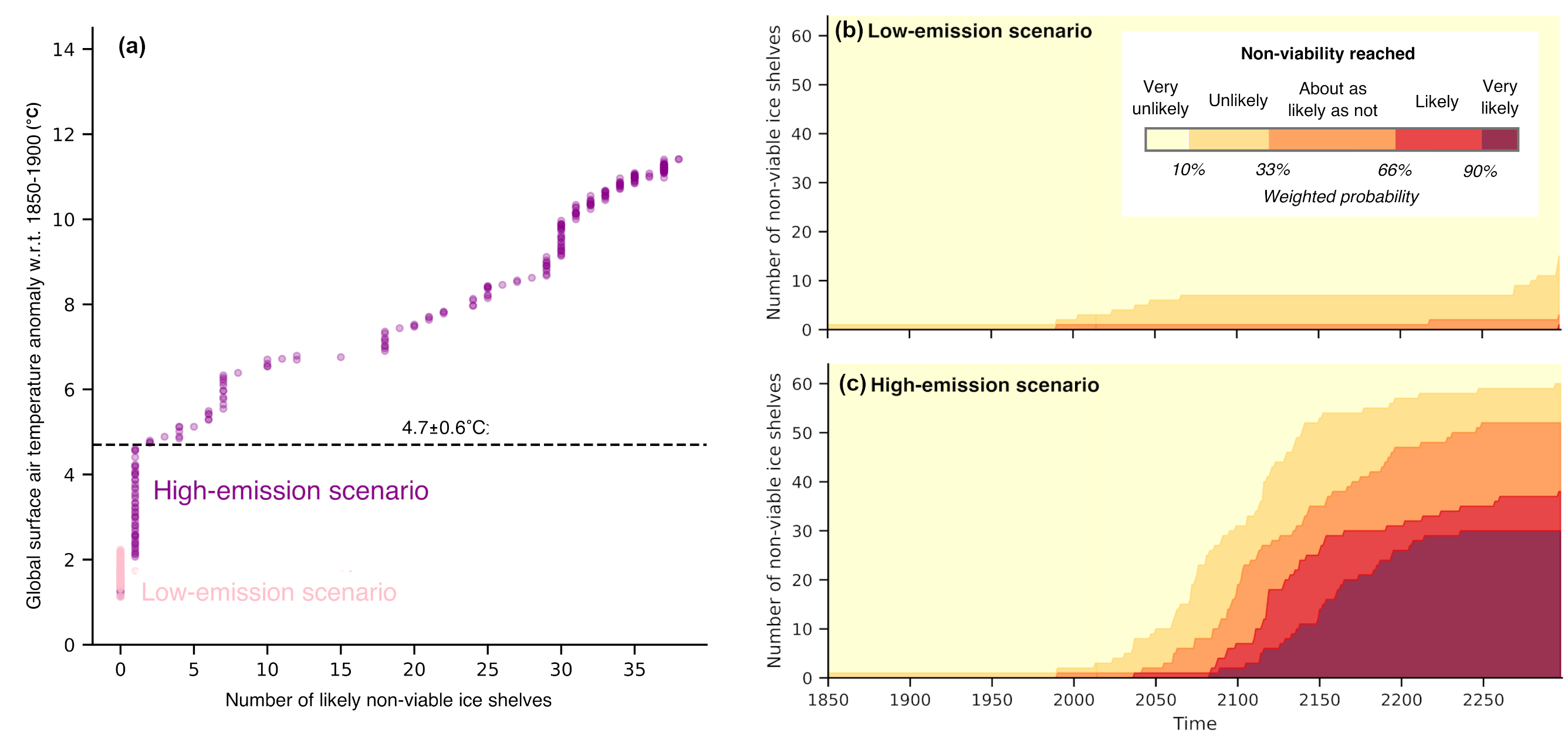 Number of non-viable ice shelves as a function of (a) global air temperatures, (b) time in a low-emission scenario (pink in panel a), and (c) time in a high emission scenario (purple in panel a). The colors in panels b and c indicate the probability of non-viability to be reached. The calculation of this probability was done in a way to give more weight to realizations close to available observations.